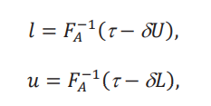 La figura 2 muestra cómo se procede. La línea sólida es la distribución aparente con las respectivas cotas 𝐹𝐴(𝑦) + δL y 𝐹𝐴(𝑦) +δU. La distribución contrafactual está en algún lugar entre esas cotas, pero no sabemos dónde exactamente. Sin embargo, podemos ver que el cuantil de la distribución contrafactual, 𝐹−1(τ,δ), tiene que estar entre 𝑙 y 𝑠. Estos dos valores satisfacen las siguientes dos ecuaciones: