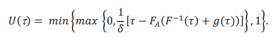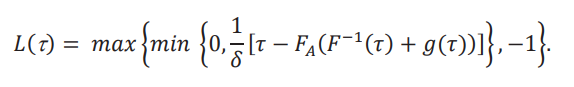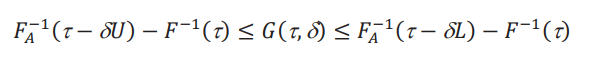 Una comparación de 𝑈(τ) con 𝐿(τ) nos muestra que en realidad son la misma fórmula, con las composición max/min alternada. Esta composición nos asegura que 𝑈(τ) ∈ [0,1] y que 𝐿(τ) ∈ [−1,0]. Lo único que cambia es que cuando 1/δ [𝜏 − 𝐹A (𝐹−1(𝜏) + 𝑔(𝜏))] es positivo, entonces es 𝑈(τ), y cuando es negativo es 𝐿(τ). Por lo tanto, el procedimiento es: primero fijamos 𝑔(τ), y luego de calcular 1/δ [𝜏 − 𝐹 (𝐹−1(𝜏) + 𝑔(𝜏))], sabemos si es que podemos inferir 𝐺(τ,δ) > 𝑔(τ) o 𝐺(τ,δ) < 𝑔(τ). Luego, interpretamos 1/δ [𝜏 − 𝐹A (𝐹−1(𝜏) + 𝑔(𝜏))] como el valor máximo 𝑈(τ) que podemos relajar 𝑈, o como el valor máximo (en valor absoluto) 𝐿(τ) que podemos relajar 𝐿.