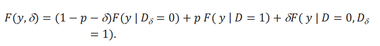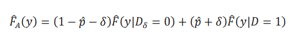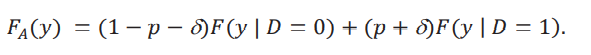 La distribución contrafactual depende de 𝐹𝐴(𝑦), que llamamos la distribución aparente, y de la diferencia entre 𝐹( 𝑦 | 𝐷 = 0, 𝐷δ = 1), la distribución de los nuevos tratados, y 𝐹( 𝑦 | 𝐷 = 1), la distribución de los tratados originalmente. Esta diferencia refleja la heterogeneidad que tiene el grupo de nuevos tratados, aquellos caracterizados por {𝐷 = 0, 𝐷δ = 1}, con respecto al grupo tratado originalmente. La distribución aparente se llama así porque no tiene esta diferencia y simplemente considera que esos individuos nuevos tratados provienen de la misma distribución que aquellos que ya fueron tratados. Por eso el peso de (𝑝+δ) dado a la distribución 𝐹(𝑦 | 𝐷 = 1).