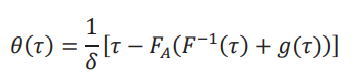 y los valores de 𝑈(𝜏) y 𝐿(𝜏) que están dados por 𝑈(𝜏) = min {max {0, 𝜃(𝜏)}, 1} y 𝐿(𝜏) = max {min {0, 𝜃(𝜏)}, −1}. Es conveniente empezar por 𝜃(𝜏), dado que para un estimador (𝜏), podemos estimar (𝜏) = min {max {0,(𝜏)}, 1} y (𝜏) = max {min {0,(𝜏)}, −1}. Sin pérdida de generalidad, vamos a normalizar 𝑔(𝜏) = 0 para aliviar notación.