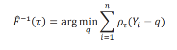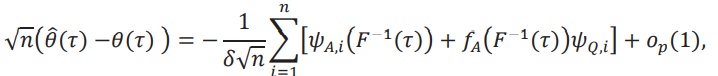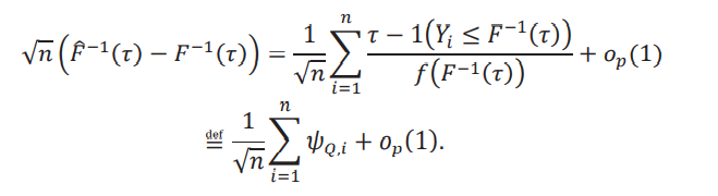 donde 𝜌𝜏(u) es la función check de Koenker y Bassett (1978): 𝜌𝜏(u) = [𝜏 − 1(u ≤ 0)]u. Un resultado estándar que se puede encontrar, por ejemplo, en el corolario 21.5 de van der Vaart (1998) es que los cuantiles son asintóticamente normales con la siguiente función de influencia: