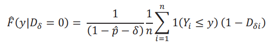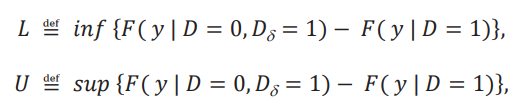 Como se mencionó anteriormente, la diferencia 𝐹( 𝑦 | 𝐷 = 0, 𝐷δ= 1) −𝐹( 𝑦 | 𝐷 = 1) no se puede calcular de los datos. En vez de ello definimos las siguientes cotas mínimas y máximas: