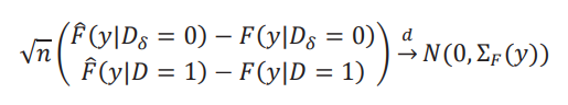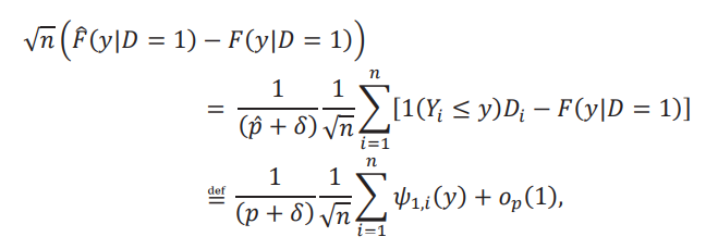 Donde hemos impuesto el supuesto que 𝐹(𝑦 | 𝐷δ = 0) = 𝐹(𝑦 | 𝐷 = 0), algo que se cumple si seleccionamos individuos al azar del grupo de control. Ahora, cuando 𝛿 se mueve, se mueve la función 𝐹𝐴 y luego se mueve la inversa 𝐹A−1. Por lo que necesitamos de una derivada funcional. Hay muchos tipos de derivadas funcionales, pero para el caso de inversas de distribuciones vamos a usar la derivada de Hadamard. Siguiendo el teorema 21.4 de van der Vaart (1998), tenemos que:
