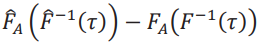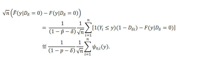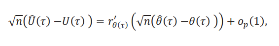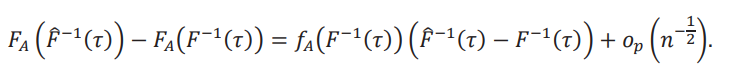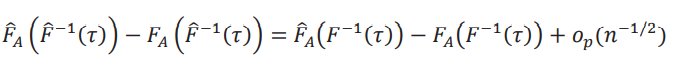 Para obtener la distribución asintótica de la frontera, luego de algo de álgebra, escribimos la diferencia como θˆ(𝜏) −𝜃(𝜏) = − 1 /δ [FˆA (Fˆ−1 (𝜏)) −𝐹A (𝐹−1(𝜏))]. Primero vamos a dejar de lado el factor − 1 / δy obtener la distribución asintótica de la expresión entre corchetes. Para ello, descomponemos la diferencia
