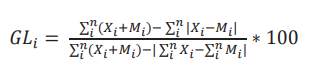 O CII, portanto, é calculado a partir do fluxo de comércio, exportações (X) e importações (M), de bens de uma determinada indústria i. Se o comércio do país A de bens da indústria i é apenas em um sentido (apenas exportações ou apenas importações) este comércio é considerado interindustrial. O índice Grubel-Lloyd captura o total do CII como parcela do comércio total de todas as indústrias (Grubel & Lloyd, 1975):