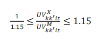 Onde UV se refere ao valor unitário dos produtos, X indica exportação, M importação, k é o país de análise, k’ é o seu parceiro comercial, i é o produto e t o ano.