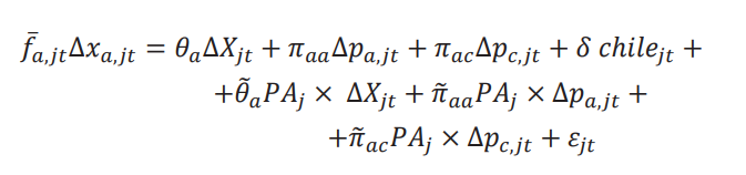 (10)donde chilejt representa una variable dicotómica que toma el valor 1 para la observación correspondiente a Chile en el año 2007, año durante el cual estuvo vigente la medida de salvaguarda y PAj es una variable dicotómica que toma el valor 1 si el país j pertenece al grupo PA, y 0 en caso contrario, i. e.j PB . De esta forma, si al menos uno de los términos, y resulta distinto de cero,implica una conducta diferente entre ambos grupos de países.