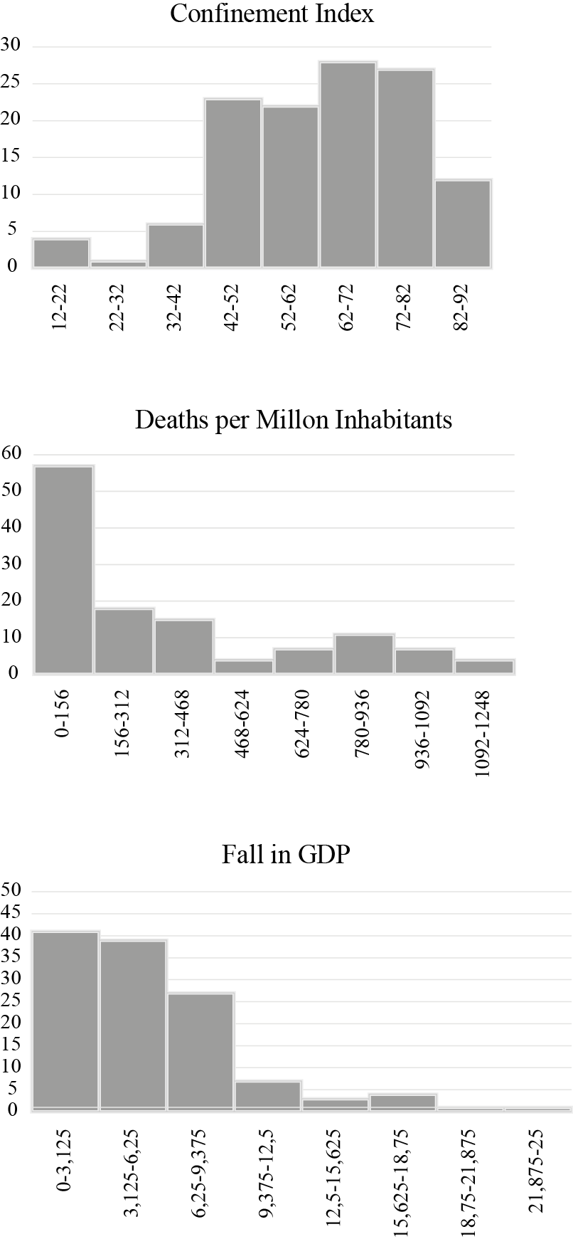 Figure 1 describes the asymmetry of the distribution for the three variables under analysis. It is observed that in two of these variables (deaths per million inhabitants and fall in GDP), the data are concentrated at the beginning, while, in the remainder (confinement), they are located at the end. As a conclusion, most countries registered low or moderate deaths per million inhabitants and a fall in GDP, while strong confinement processes were the norm. Conversely, the countries with significant numbers of deaths and falling GDP were the exception, while those that had mild confinement were also the least numerous cases.