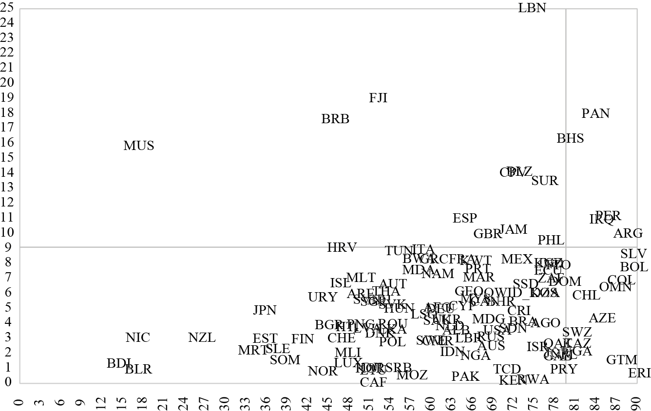 The lower-left quadrant includes countries with GDP falls below 9.09% and low or moderate confinement rates (below 79.61). This quadrant concentrates the largest number of countries such as Mexico, Italy, Brazil, France, Uruguay, Japan, the United States, and Russia, among others. This behavior was the norm, the standard. The lower-right quadrant presents countries with low or moderate falls in GDP (below 9.09%) and high rates of confinement (greater than 79.61). Here there are economies such as Chile, Bolivia, Colombia, Guatemala, and Switzerland, among others. Finally, the upper-right quadrant contains economies with the worst performance (falls in GDP above 9.09%) and a high index of confinement (above 79.61). It is the worst location to be placed and only five countries appear: Argentina, Peru, Iraq, The Bahamas, and Panama.