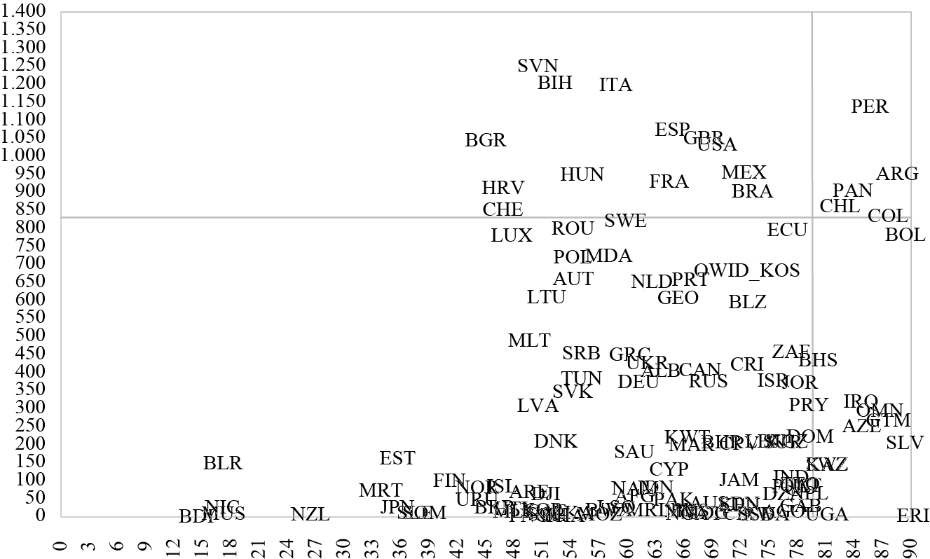 The largest number of countries is in the lower-left quadrant, where there are low confinement rates (below 79.61) and moderate or low deaths per million inhabitants (below 830.34). These are most of the countries of the sample, such as Sweden, Poland, Ecuador, Canada, Russia, Paraguay, Greece, Japan, and Germany, among others.