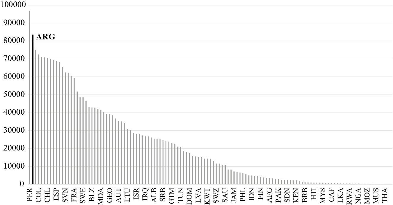 As a closing of this section, the ordinal index for this analysis is presented in Figure 7. Countries with the worst ten positions are Panama (1), Peru (2), Spain (3), Italy (4), the United Kingdom (5), Argentina (6), Belize (7), Croatia (8), Mexico (9), and France (10). Again, Peru and Argentina are the main countries with the worst figures in Latin America, while Spain, the United Kingdom, and Italy are those in Europe.