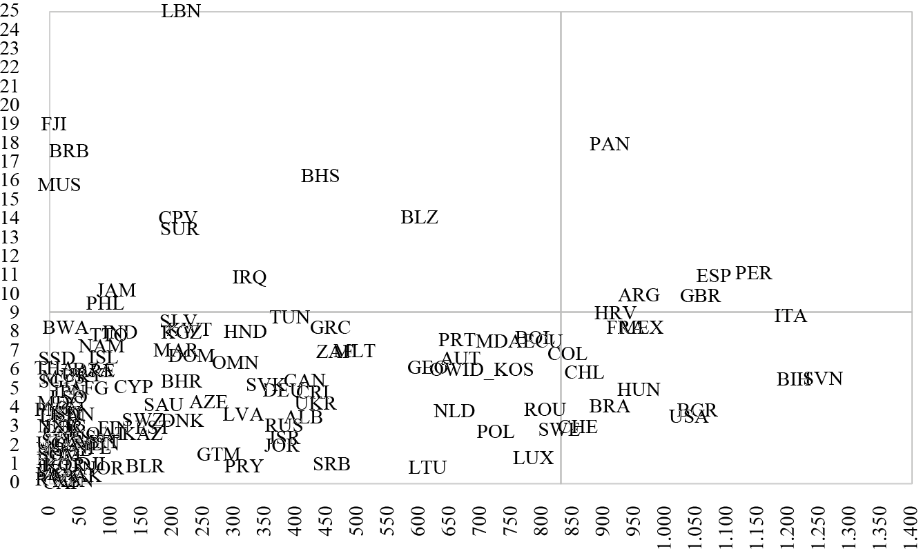 The lower-right quadrant with significant numbers of deaths (greater than 830.34), but low and moderate falls in GDP (below 9.09%). Here, health aspects were more dramatic than the economic ones. This group comprises countries such as Italy, Brazil, Mexico, France, Chile, Colombia, and the United States, among others.