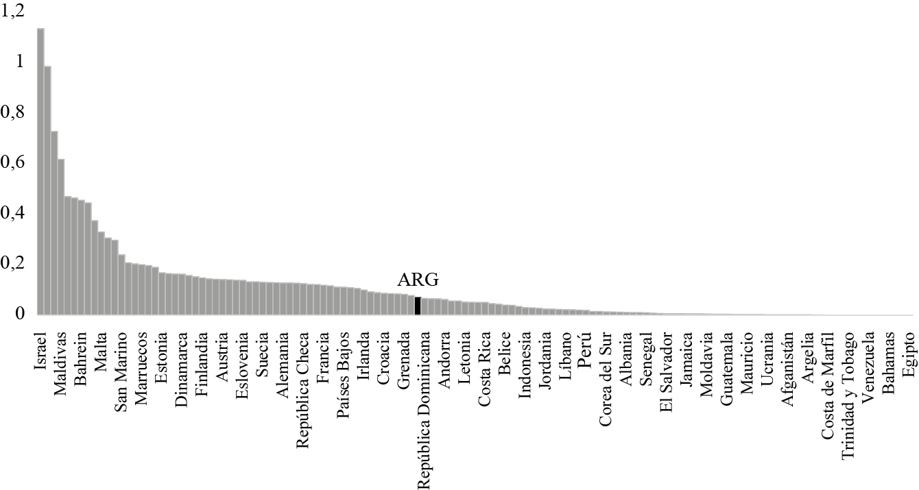 Figure 8 describes the proportion of vaccinated people per country, from the highest to the lowest. It is observed that Israel inoculated 113.6% of its population and this is an extraordinary case. It is followed by the Seychelles (98.6%), the United Arab Emirates (72.9%), and the Maldives (61.8%), the only nations that are above 50%. Then, there are countries such as Chile (46.5%), Bahrain (45.6%), and the United Kingdom (44.5%), with values higher than 40% (but below 50%). Of our analysis group, Spain —like many European countries— is between 10% and 20% (its percentage was 12.9%). Practically all Latin American economies are below 10%: Uruguay (8.9%), Argentina (7%), Brazil (6.5%), Mexico (4.5%), Colombia (2.3%), and Peru (2%).