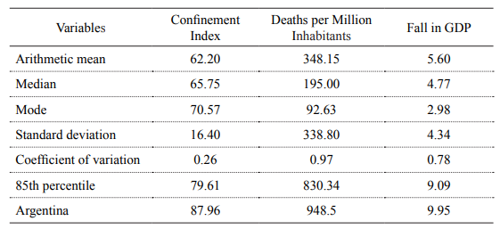 In summary, Argentina is located as one of the worst countries in the world when dealing with the COVID-19 pandemic. In 2020, its GDP fall doubled the average contraction of the 123 countries; deaths per million inhabitants tripled the mean, and the confinement severity index was nearly 50% above the average.