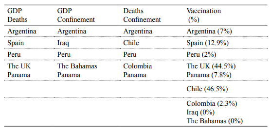 From the previous sections, a common denominator appears2. Regardless of the indicators or variables that are correlated, Argentina is in the worst quadrant in all cases. Considering GDP and confinement, the place is shared with Peru, The Bahamas, Iraq, and Panama. Regarding deaths and confinement, Argentina shares the group with Peru, Chile, Colombia, and Panama. On the other hand, in relation to the fall in GDP and deaths, Argentina is also in the worst performing group along with the United Kingdom, Peru, Spain, and Panama. The severe confinement proved not to resolve the impact of the deaths in relative terms. Argentina had higher deaths per million inhabitants than Brazil and slightly less than the United States. Finally, as regards the proportion of vaccinated population, countries such as the United Kingdom, Chile, and Spain are not present in the critical group, but Argentina, Peru, Colombia, The Bahamas, Panama, and Iraq remain (see Table 2).