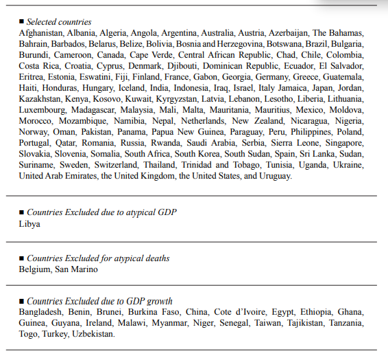 The sample comprises 148 countries for which data were available for the three variables (GDP, confinement, and deaths). However, 123 of those countries were used in this article considering the exclusion criteria detailed below. An atypical data feature was studied using the basic criterion of descriptive statistics: the arithmetic mean plus/minus three standard deviations: . As mentioned in the previous section, those countries that present economic growth in 2020 were excluded from the sample. (See the Annex for the complete list of selected and excluded countries and the reasons.)