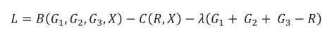 En esta sección se presenta un modelo simple de determinantes del tamaño y la composición del gasto público. Se supone un solo nivel de gobierno (o el gasto consolidado de varios niveles). El gobierno provee tres bienes (G1, G2, G3). El beneficio de cada tipo de gasto es separable, los beneficios marginales son positivos y decrecientes. El gasto total se financia con un impuesto único, con costo marginal de recaudación positivo y creciente. X es una variable exógena que modifica el beneficio de los bienes y el costo de la recaudación. El gobierno maximiza el beneficio neto dado por