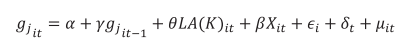 (1)Donde gjit es la participación del gasto j de la provincia i en el año t, LA(K)it es el logaritmo del coeficiente de apertura (exportaciones/PBG) de la provincia i en el año t (LAit) o el logaritmo del coeficiente del índice de globalización (KOFA) de la provincia i en el año t (LKit), Xites un vector que incluye otros determinantes de la participación del gasto j, εi son características específicas del país i no observables y fijas en el tiempo, δt son efectos temporales no observables y μit es el término de error aleatorio. La variable dependiente rezagada (gjit-1) se incluye con el objetivo de captar persistencia en el tiempo de la participación de cada gasto público y teniendo en cuenta que la composición de los gastos provinciales cambia y se ajusta lentamente a lo largo del tiempo.