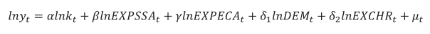 (2)Where Yt, Kt , Ltα and (1-α) are as already explained, EXPSSA and EXPECA denote export destinations – export to countries in sub-Saharan Africa (SSA) and Europe and Central Asia (ECA) respectively and Wt represents control variables – democracy and exchange rate. The parameters β, γ and δ are the elasticities of the respective variables. Dividing both sides of Equation (2) by Ltto obtain per capita variables and taking natural logarithm, the estimable form of Equation (2) is specified in Equation (3).