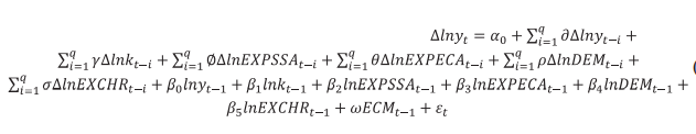 Once the ARDL bounds test confirms the presence of cointegration, the long and short-run parameters of Equation (3) are estimated. Equation (6) is the ARDL form of Equation (3) which captures both the long and short-run coefficients.