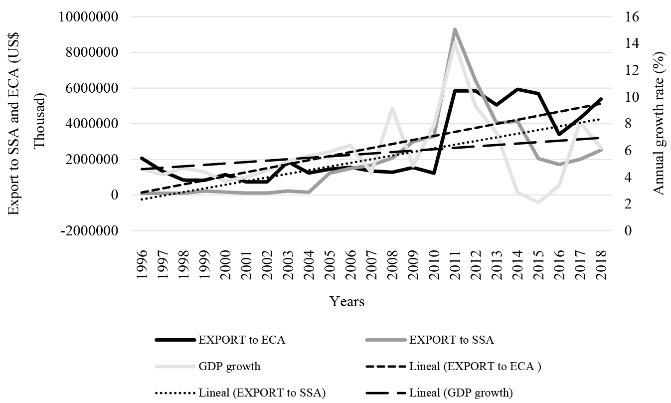 The summary of the descriptive statistics and the trends (of the key variables – export to SSA, export to ECA and economic growth) of the variables are reported in Table 1 and Figure 1 respectively.