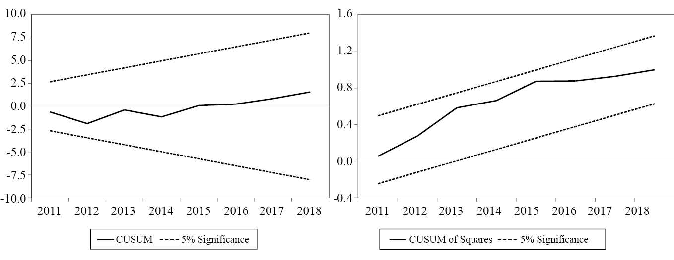 The results from the diagnostic tests indeed show that the estimated model is free from the aforementioned econometric problems. This is because all the various tests statistic values are insignificant implying the non-rejection of the null hypotheses which state the absence of these econometric problems in the estimated model. Also, the plots for CUSUM and CUSUMSQ (see Figure 2) indicate that the estimated model is stable over the study period.