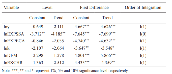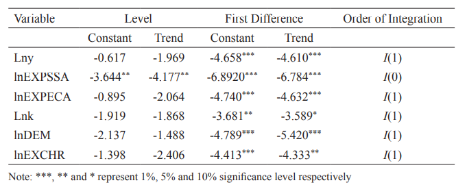 It is observed that the ADF unit root test results are consistent with those obtained from the PP unit root test. Both test results show that the variables are stationary at either level or first difference and this confirms the appropriateness of the ARDL estimation technique the study adopts. Specifically, it is revealed that with the exception of export to the SSA region which is stationary at level, the remaining variables are all stationary at first difference. After ascertaining the stationarity property of the series, the study then proceeds to establish the existence or otherwise of a valid long-run relationship among the variables.