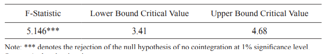 (5)In this test, two critical bound values – lower and upper bound critical values are provided [I(0) and I(1) respectively] (see, Pesaran et al., 2001). The null hypothesis of no cointegration is rejected if the computed F-statistic is greater than the upper bound critical value and the implication is that the variables are cointegrated; there exists a valid long-run relationship among the variables. The existence of the long-run relationship means that the model is able to return to long-run equilibrium after any exogenous shock to any of the variables in the model. Also, if the computed F-statistic is less than the lower bound critical value, we fail to reject the null hypothesis of no cointegration and the implication is that there is no valid long-run relationship among the variables. The result is inconclusive if the computed F-statistic falls within the lower and upper bound critical values.