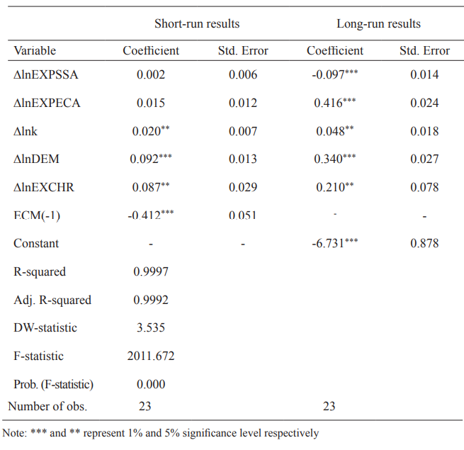 Finally, regarding the error correction term [ECM (-1)] which measures the speed of adjustment, the results show that it is negative and significant, further confirming the long-run relationship among the variables established by the bounds test. Specifically, the coefficient indicates that when there is a shock to any of the explanatory variables in the short-run, long-run equilibrium will be restored at a speed of 41%. Also, the R-squared and adjusted R-squared values indicate that about 99% of the variation in the dependent variable – economic growth – is explained by the independent variables used in the study: export to SSA countries, export to ECA countries, capital, democracy and exchange rate. Again, the probability value of the F-statistic also shows that the model is well fitted given the highly significant probability value.