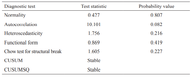 The study further performs several diagnostic tests to ensure that the results obtained are reliable and consistent for effective policy purposes. These diagnostic tests are autocorrelation, normality, heteroscedasticity, functional form, model stability and chow test for structural break. The autocorrelation test is conducted using the Breusch-Godfrey LM test whereas that of normality is done using the Jarque-Bera test. The heteroscedasticity and functional form tests are performed using the Breusch-Pagan-Godfrey and Ramsey reset tests respectively. Finally, the plots of cumulative sum (CUSUM) and cumulative sum of squares (CUSUMSQ) are employed to ascertain the stability of the estimated model. In these tests, the null hypotheses of absence of these problems are tested against the alternative hypotheses of their presence in the model. The non-rejection of the null hypotheses indicate that the estimated model is free from the aforementioned econometric problems and their rejection implies otherwise.