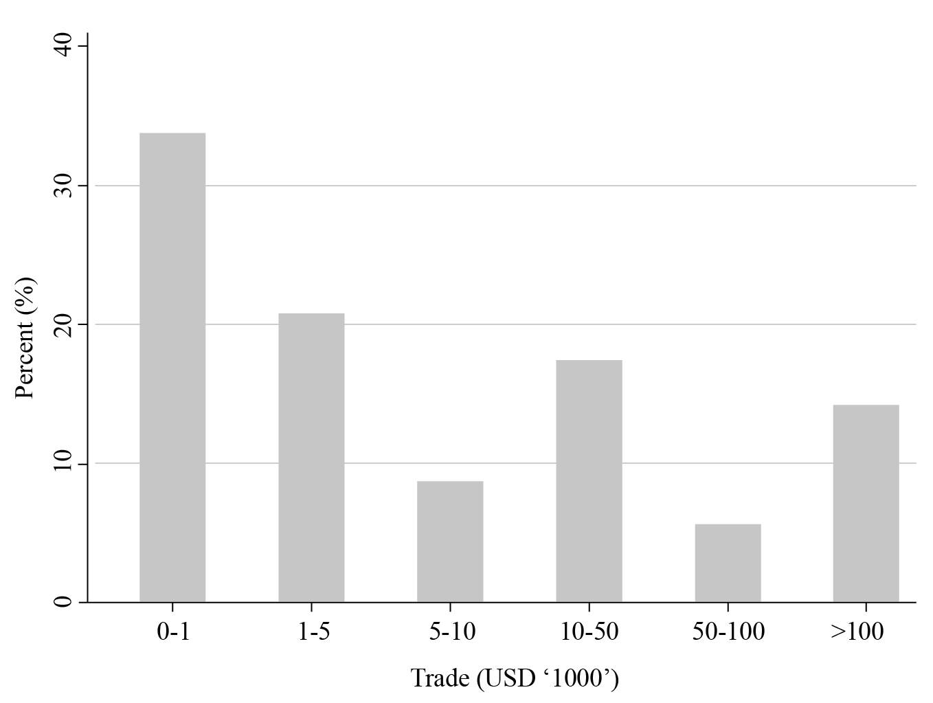 Figure 1 displays the distribution of export values from Cote d’Ivoire over our study period. About 33% of exports are less than US$ 1,000 followed by those whose value is between US$ 1,000 and US$ 5,000. Overall, slightly less than a half of exports from Ivory Coast are over US$ 5,000. About 14% of exports are above US$ 100,000. This proves that Cote d’Ivoire is among the top exporters in SSA region, since most countries from SSA export less than US$ 100,000 worth of products (Kamuganga, 2012).