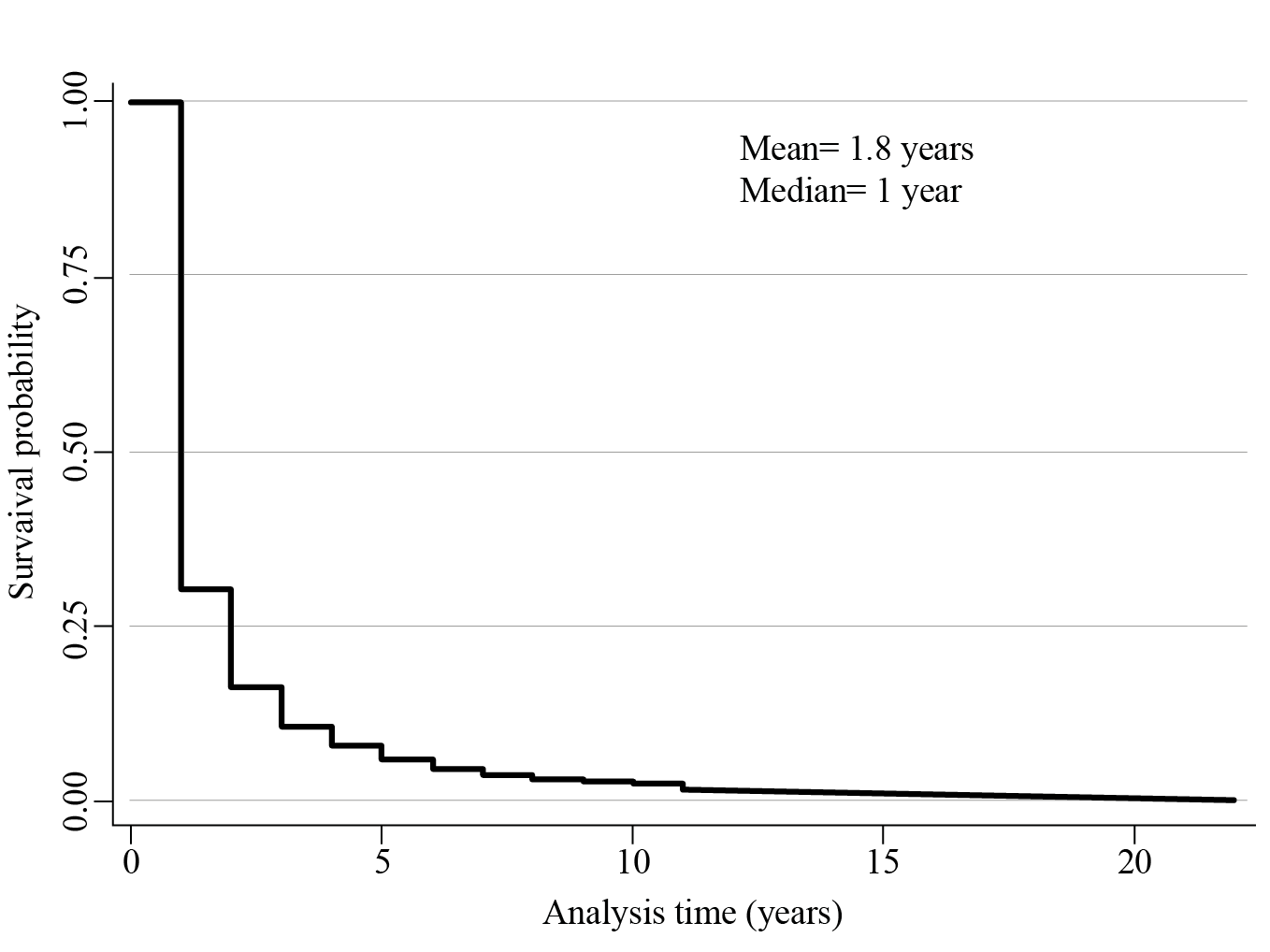Next, we described the distribution of spells in Cote d’Ivoire. A spell is the length of time (in years for our case) a product is exported to a specific destination nonstop. Our study had a total of 125,033 trade relationships in the period of study. Out of this, about 55% of them lasted for a single year, as shown in Table 1. Nearly 15% of them lasted for two years. Cumulatively, at least 70% of export relationships from Cote d’Ivoire lasted for two years. This indicates that most trade relationships died by the second year. The failure rate was high such that roughly 5% of trade relationships lasted for more than a decade.