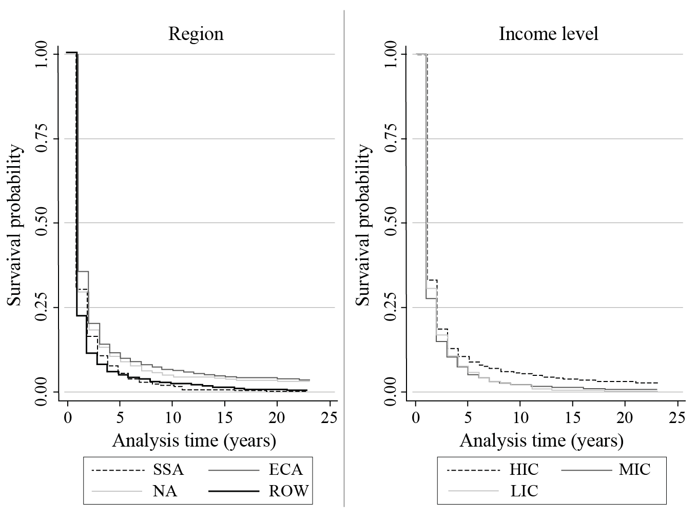 The left-hand side figure shows that survival is the highest in high-income countries possibly due to the high demand from being large markets. There is no significant difference in survival for low- and middle-income countries.