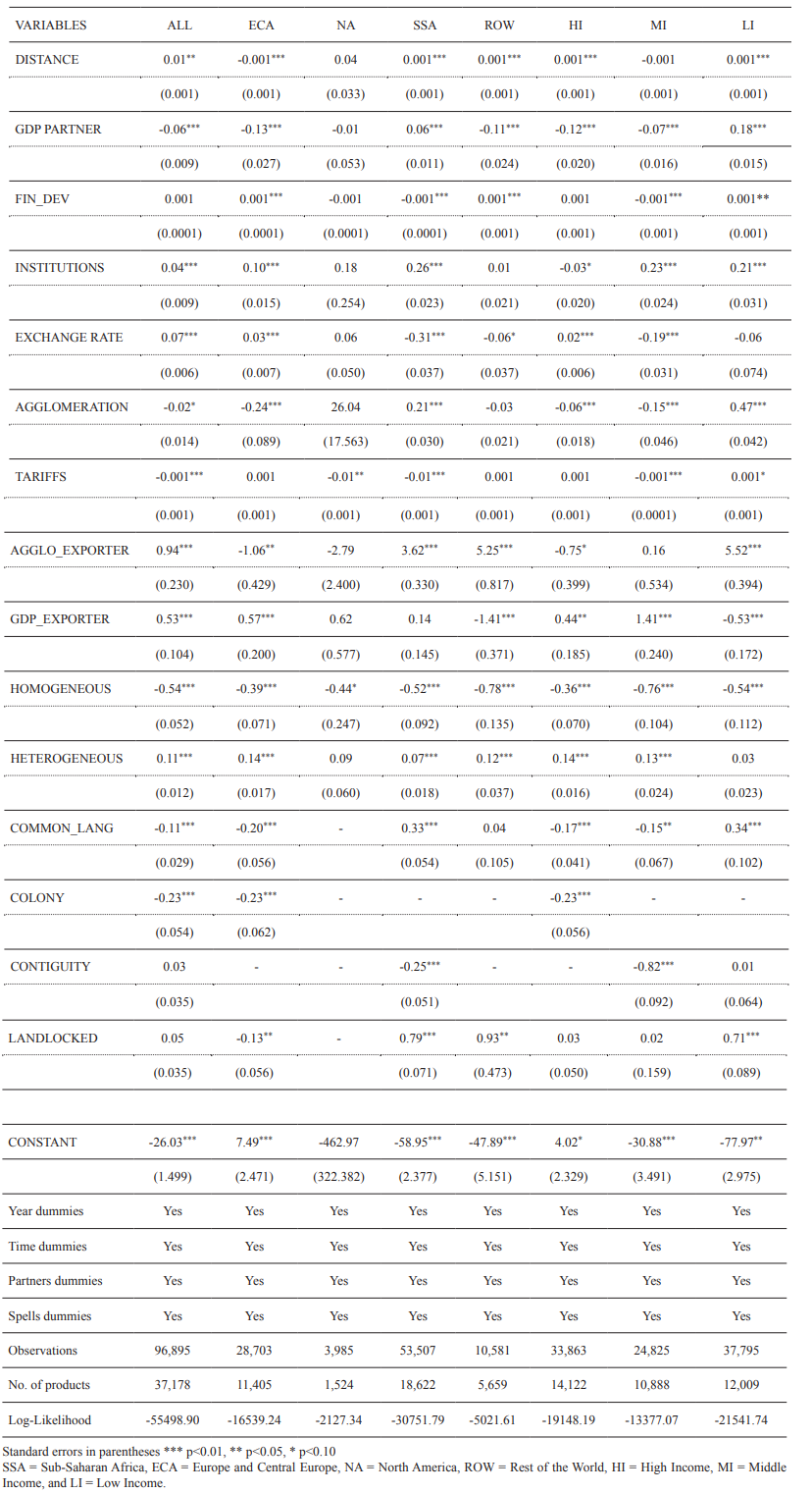 To study factors that influence export duration in Cote d’Ivoire, we used a discrete-time logit model. A Hausman test was first conducted to establish the appropriate model between fixed and random effects. The result recommended the random effects model. The first column in Table 2 presents baseline results of the overall survival rate. The second to fifth columns display results by region, while the last three columns show results by level of income. In each specification, the dependent variable is the hazard rate.