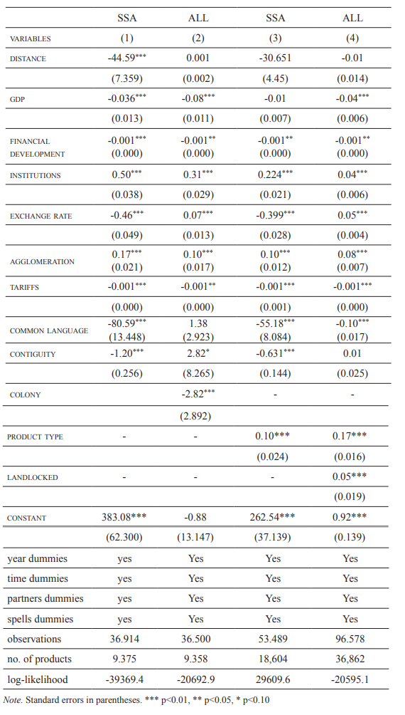 The second robustness analysis involves the use of a probit model with 6-digit level data. Findings are presented in Models 3 and 4 in Table 3. In this design, results from the baseline specification are the preferred ones. Product type affects the probability of exports to live. When we consider whether the importing country is landlocked or not, we conclude that being landlocked is potentially damageable for the life of Ivorian exports. Financial development and economic market size (GDP) increase the export’s survival rate. In summary, it appears that the findings are robust across different samples and specifications made.