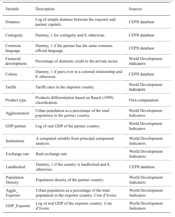 This study used annual country-product-destination data from the UN Comtrade Database on exports from Cote d’Ivoire over the period 1996 to 2018. The data is at the 6-digit level classification of the Harmonized System (HS). Import records of destination countries were used instead of exporter’s records because they are more reliable, especially in developing countries (Brenton et al., 2010). Data for other variables is from several sources. Institutions were created using the Principal Component Analysis based on the worldwide governance indicator database (Kaufmann, Kraay, & Mastruzzi, 2011). Many variables were obtained from the World Development Indicators database, while gravity variables were taken from the CEP11 database. A detailed definition of variables used is provided in the appendix.