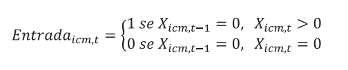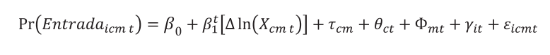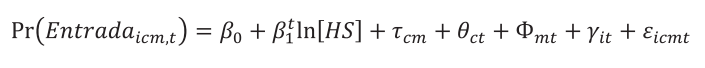(4)Entradaicm,t = 1 se o país c não estava exportando o produto i para o país m em t - 1, mas começou a exportar em t, e Entradaicm,t = 0 se o país c não estava exportando o produto i para o país m em t - 1 e continuou sem exportar em t. Os produtos são classificados de acordo com o Sistema Harmonizado (SH), ao nível de 6 dígitos. A amostra inclui novos exportadores e exportadores existentes que entraram em pelo menos um novo mercado no ano t. Para poder analisar a probabilidade de entrada, define-se Entradaicm,t= 0 para todos os países de destino potenciais que não foram atendidos pelo país c através da exportação do produto i antes do ano t. Os destinos potenciais considerados são todos aqueles países que foram atendidos por pelos menos um vizinho.