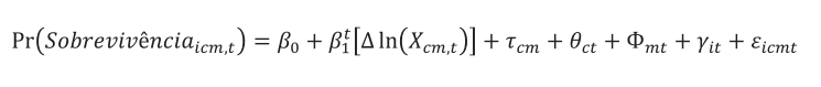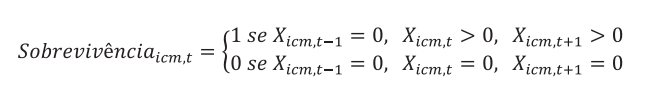 (8)Sobrevivênciaicm,t= 1 se o país c não estava exportando o produto i para o país m em t - 1, mas começou a exportar em t e continuou a exportar em t + 1 e Sobrevivênciaicm,t = 0 se o país c não estava exportando o produto i para o país m em t - 1 e continuou sem exportar em t e t + 1. Sendo assim, espera-se que as evidências sobre o sucesso das exportações, definidas como a sobrevivência além do primeiro ano após a entrada, sejam positivas, dado o sinal emitido pelos países vizinhos sobre o mercado m.