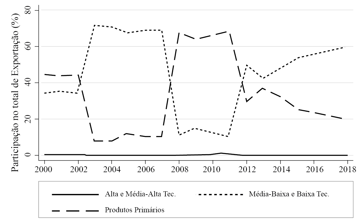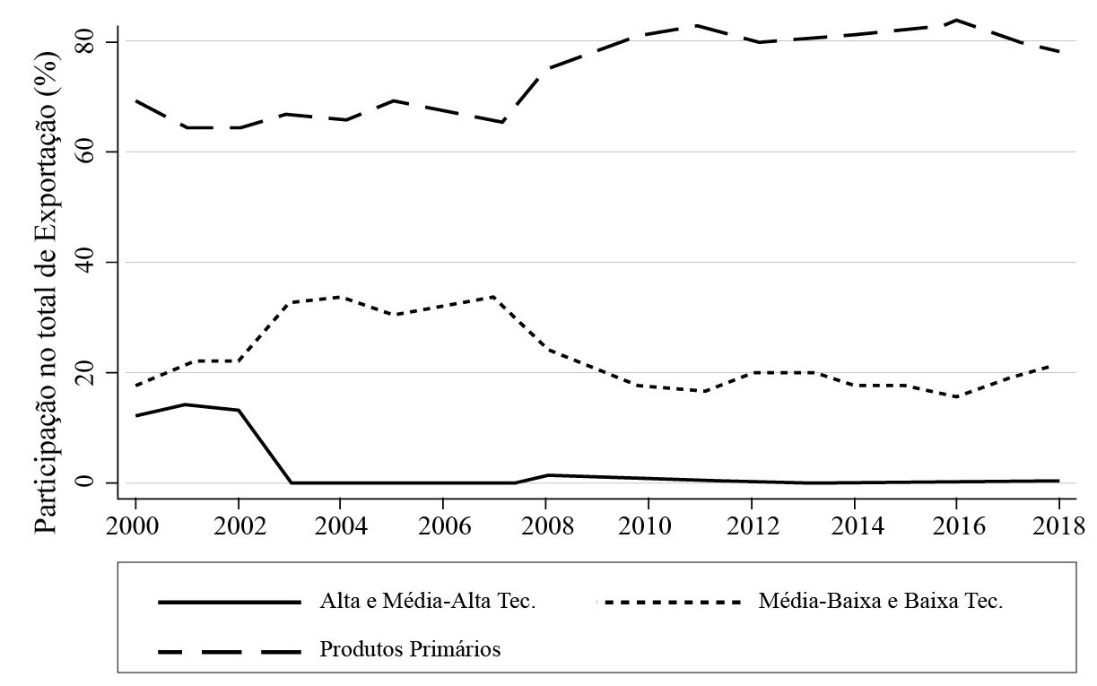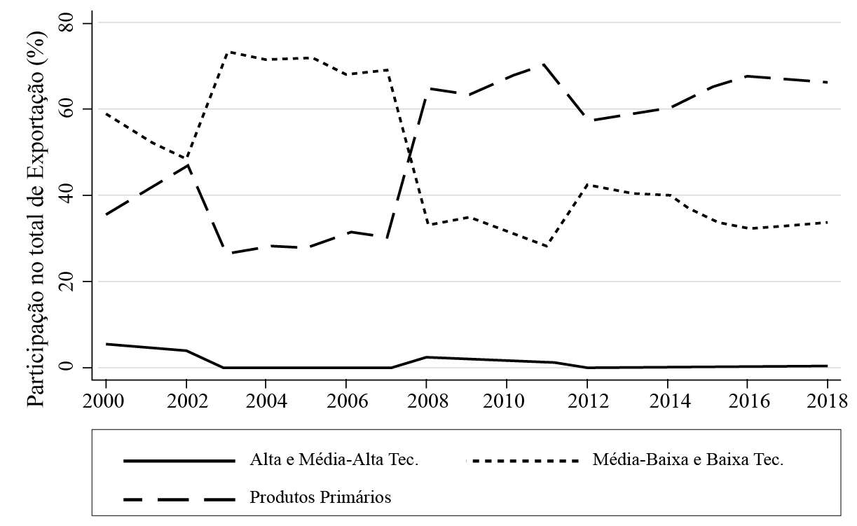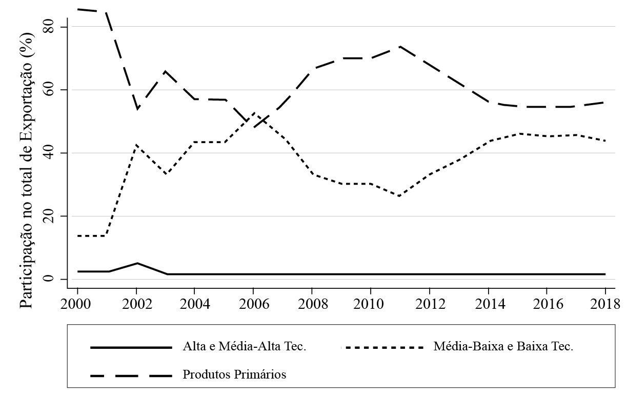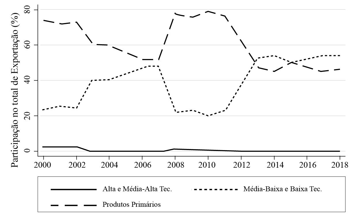 O padrão de comércio dos países da América do Sul contempla uma pauta de exportação baseada em produtos de menor intensidade tecnológica, sendo eles produtos primários e extração. A Figura 1 abaixo permite essa visualização, onde os produtos foram classificados através da sua intensidade tecnológica4. Sendo assim, pode-se observar que, para esse conjunto de países vizinhos selecionados da América do Sul, tem-se uma pauta de exportação composta basicamente de produtos primários, seguida de produtos de baixa e média-baixa intensidade tecnológica e, por último, os produtos de média-alta e alta intensidade tecnológica. No Apêndice destacam-se as exportações por intensidade tecnológica de cada país considerado na análise. No caso da Argentina, os produtos mais exportados nos últimos anos são os primários, dando destaque à soja e derivados. A Bolívia exporta mais produtos de média-baixa e baixa intensidade tecnológica, destacando-se o gás liquefeito de petróleo. Em observância ao Brasil, sua pauta exportadora é composta basicamente de produtos primários, elucidando a forte participação da soja.