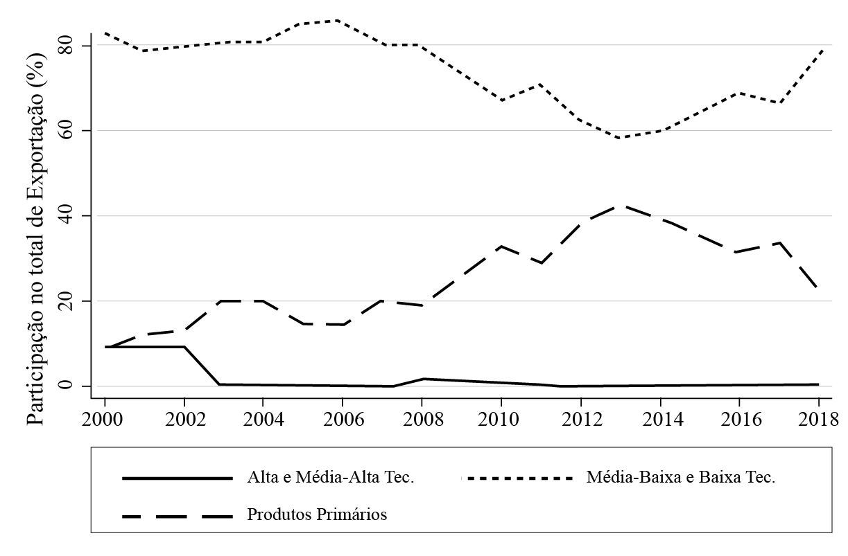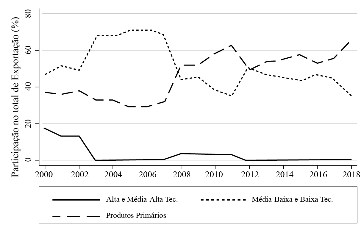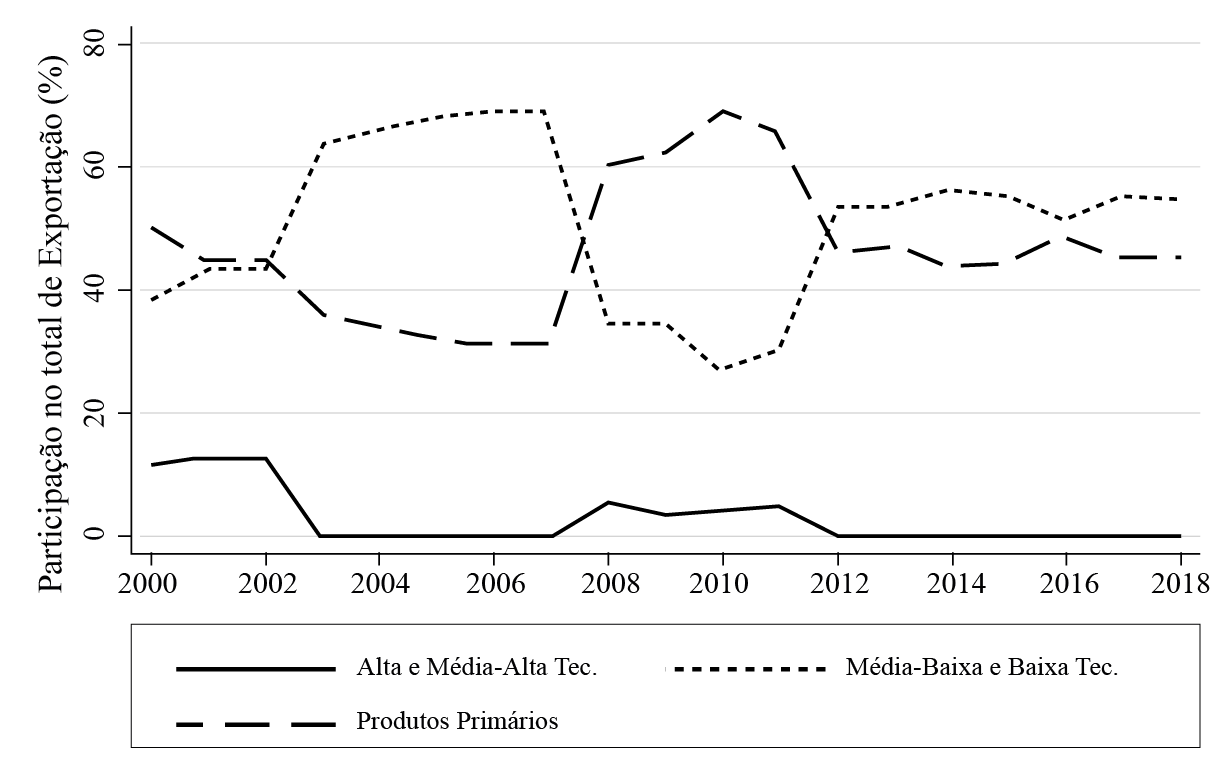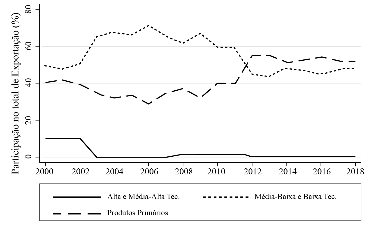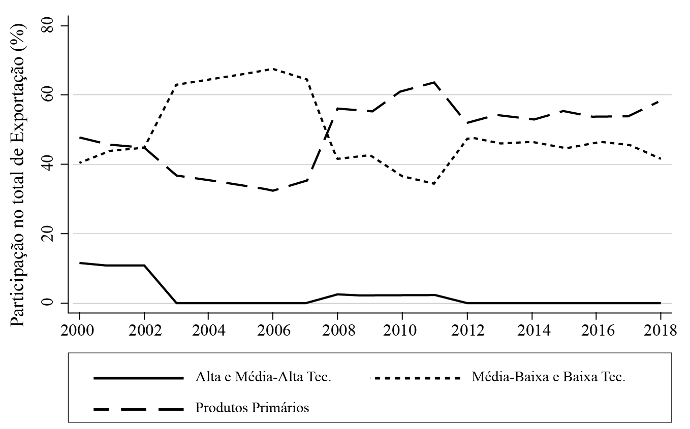 O padrão de comércio dos países da América do Sul contempla uma pauta de exportação baseada em produtos de menor intensidade tecnológica, sendo eles produtos primários e extração. A Figura 1 abaixo permite essa visualização, onde os produtos foram classificados através da sua intensidade tecnológica4. Sendo assim, pode-se observar que, para esse conjunto de países vizinhos selecionados da América do Sul, tem-se uma pauta de exportação composta basicamente de produtos primários, seguida de produtos de baixa e média-baixa intensidade tecnológica e, por último, os produtos de média-alta e alta intensidade tecnológica. No Apêndice destacam-se as exportações por intensidade tecnológica de cada país considerado na análise. No caso da Argentina, os produtos mais exportados nos últimos anos são os primários, dando destaque à soja e derivados. A Bolívia exporta mais produtos de média-baixa e baixa intensidade tecnológica, destacando-se o gás liquefeito de petróleo. Em observância ao Brasil, sua pauta exportadora é composta basicamente de produtos primários, elucidando a forte participação da soja.