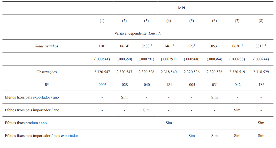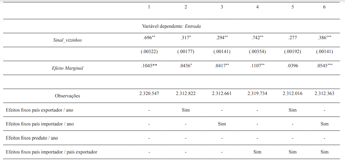 Elucida-se que, ao considerar países que possuem características similares, o sinal emitido por um deles e a experiência no comércio podem auxiliar os demais países vizinhos a entrarem no mercado externo. Nesse sentido, a Tabela 1 apresenta o resultado principal do estudo, conforme a equação (3) descrita na metodologia, no qual o objetivo foi verificar se a probabilidade de um produto entrar em um mercado estrangeiro aumenta dado um sinal positivo emitido pelos países vizinhos sobre a demanda desse mercado.