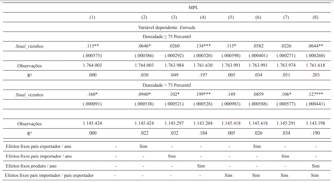 Na Tabela 3, estimou-se a relação entre o sinal emitido pelos vizinhos e a probabilidade de entrada em mercado estrangeiro, considerando diferentes percentis de densidade de vizinhos. Para este fim, utiliza-se densidade de vizinhos, que é igual ao número de vizinhos do país que exportam continuamente para o país dividido pela área do país . Como os países variam em tamanho, levam-se em consideração os atritos geográficos que afetam a probabilidade de encontrar um vizinho e, assim, aprender com ele, conforme Fernandes e Tang (2014).