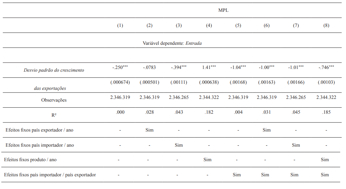 Isto demonstra que a probabilidade de um país entrar em um mercado estrangeiro diminui dado um sinal mais disperso emitido pelos países vizinhos, ou seja, o crescimento das exportações não apresenta uma mesma tendência para os anos, possuindo oscilações significativas. Sendo assim, os países que verificam esse comportamento entendem o sinal como disperso (menor aprendizagem) diminuindo a probabilidade de entrar no mercado externo ao exportar determinado produto.
