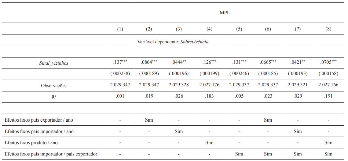 No que se refere à robustez dos resultados, além de todas as diferentes especificações consideradas na análise, ou seja, os diferentes efeitos fixos incluídos, para garantir que se esteja captando o sinal emitido pelos vizinhos para a decisão de entrada de um novo exportador no mercado estrangeiro, estimou-se também a equação (3) por um Modelo Probit, com o intuito de verificar se os resultados encontrados anteriormente através do MPL mantêm-se quando se utiliza um modelo diferente. Os resultados obtidos podem ser visualizados na Tabela 2.