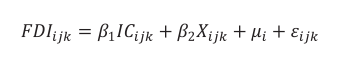 ICijk, is a matrix of objective variables4 that represents investment climate constraints (the physical infrastructure, the financial infrastructure, and customs clearance of international trade). Xijk, is a matrix of other determinants of firm location. Following the literature, we included the firm’s age to represent the background of the firm (Ottaviano and Martincus, 2011) and size to capture scale and efficiency (Bernard and Jensen, 2004). In alignment with Kinda (2010) and Manole and Spatareanu (2015), we also considered agglomeration. The age of a firm in a host country is calculated as the difference between the year of the survey and the year that the firm began operations. The agglomeration effects are represented by the number of foreign firms in a given sector in a specific region. This variable represents the average attractiveness of each specific region and might control for the direct effect of the regional-sectoral investment climate on FDI. Table A1 lists all the variables and their definitions. and are country effects and error terms, respectively. We took into account the non-observable differences among countries by including a dummy variable for fixed effects.