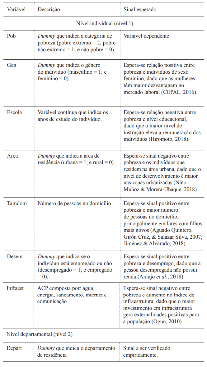 É importante ainda destacar que são incluídas também no modelo outras variáveis de controle apontadas na literatura que determinam o status de pobreza dos indivíduos, tais como gênero, nível de escolaridade, área de residência, departamento do país, total de membros do lar e desemprego. As variáveis explicativas selecionadas encontram-se no Quadro 1.