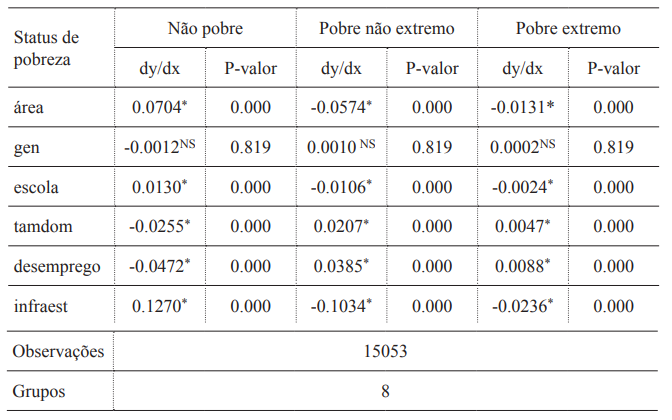 Com relação às demais variáveis de controle, observa-se que residir na área urbana está associado com 7.04% maior probabilidade de estar acima da linha de pobreza, além de 5.74% menor probabilidade de estar abaixo da linha de pobreza não extrema e 1.31% de estar abaixo da linha de pobreza extrema. Esses resultados indicam que existe maior probabilidade de uma família ser pobre se residir na zona rural. No geral, a pobreza rural é mais intensa que a pobreza urbana devido a diferentes fatores, como o fato do rendimento do trabalho, serviços de saúde, de educação, acesso a bens de consumo e condições habitacionais serem mais precários, e estes problemas parecem não ter uma solução no curto prazo (Fortini et al., 2019).