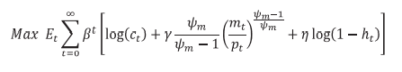 O problema de otimização do consumidor representativo envolve a maximização da utilidade intertemporal escolhendo o nível de consumo ct, a demanda por encaixes reais
