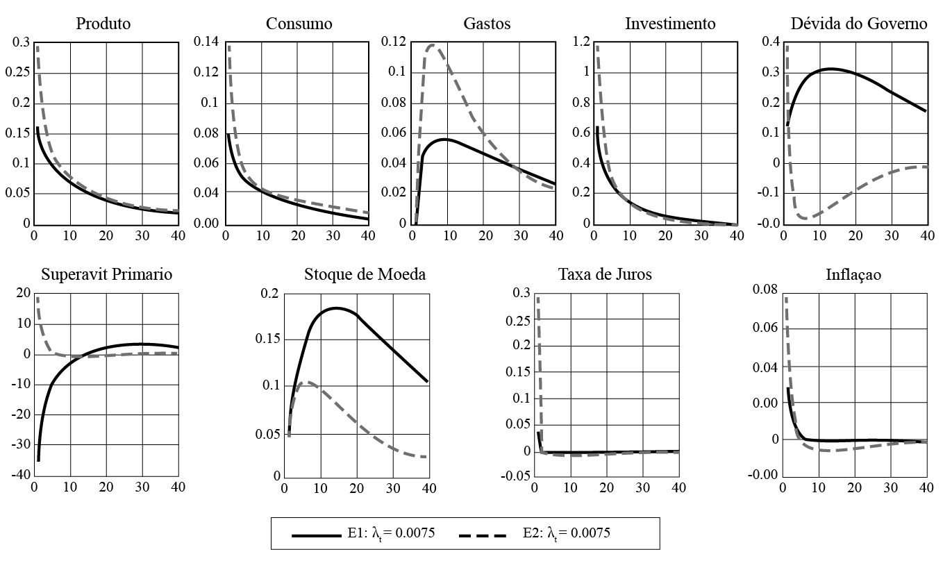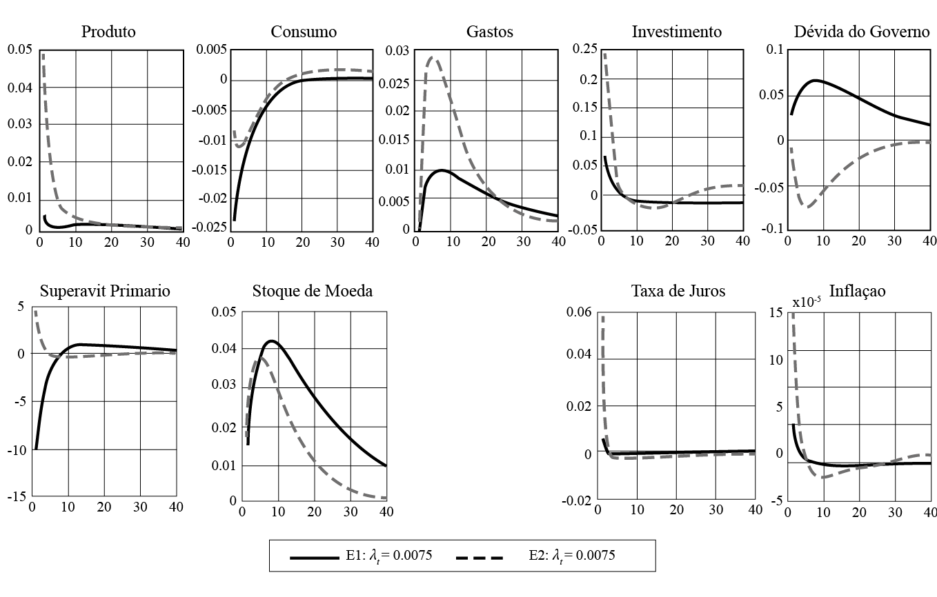 Assim como para o choque de produtividade, os gastos do governo crescem de forma procíclica indexada à taxa de inflação do período anterior sem comprometer a regra fiscal, especialmente no cenário em que há o cumprimento do teto dos gastos, quando o produto da economia cresceu mais fortemente. No entanto, como os gastos públicos crescem a uma menor magnitude em relação à arrecadação dos tributos, a resposta do resultado primário e da dívida pública ao choque do tributo sobre consumo ocorre de acordo com a postura fiscal do governo.