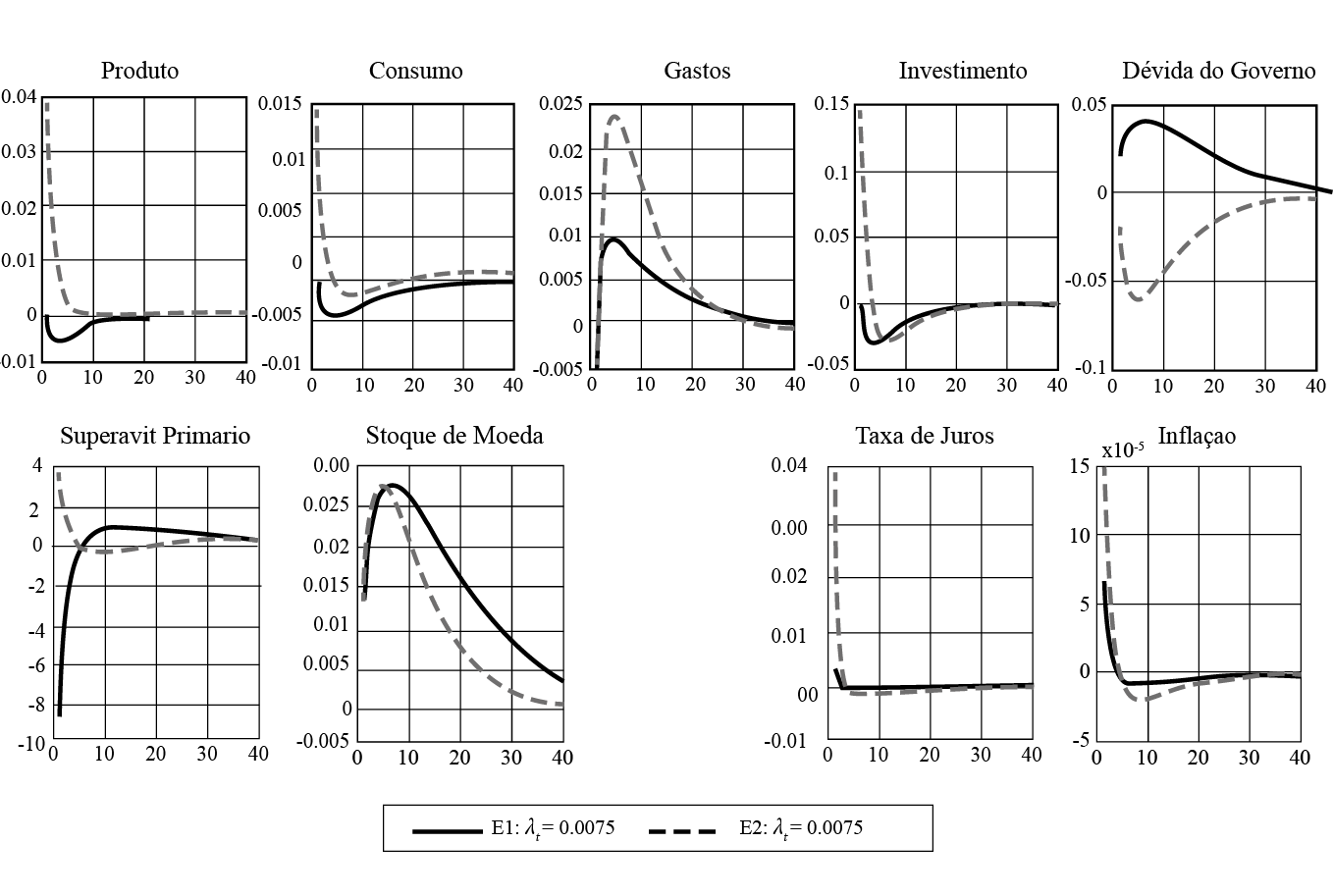 Por sua vez, para todos os choques e em todos os cenários simulados, a resposta endógena da taxa de juro foi positiva ao aumento da inflação que se estabilizou a partir do quinto período, refletindo a reação da autoridade monetária ao aumento do nível geral de preços da economia, no contexto em que há o cumprimento de uma meta de inflação explícita no modelo. Neste caso, de acordo com De Resende e Rebei (2008), o que se observa é que o efeito indireto endógeno da expansão do estoque de moeda domina o efeito direto do choque exógeno de produtividade, o que resulta em um aumento líquido da taxa inflação.